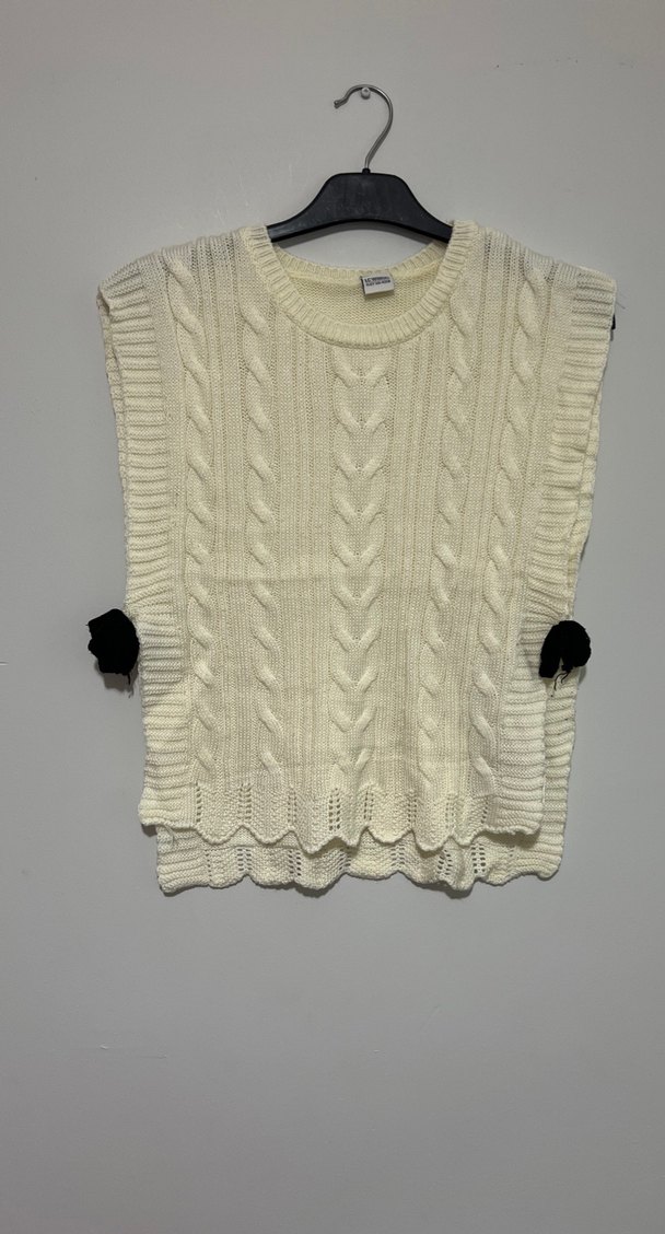 Beyaz renkli, kolsuz mini kazak, gevşek kesim ve yuvarlak yaka ile örme kumaştan üretilmiştir. Rahat sokak tarzına uygundur.