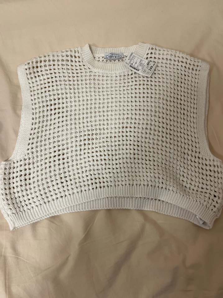 Beyaz, kolsuz örgü kazak, salaş kesim ve yuvarlak yaka ile rahat kullanım sunar. Nefes alabilen açık örgü deseni günlük şıklık sağlar. Hiç kullanılmadı etiketi mevcuttur.250 tl ye aldım