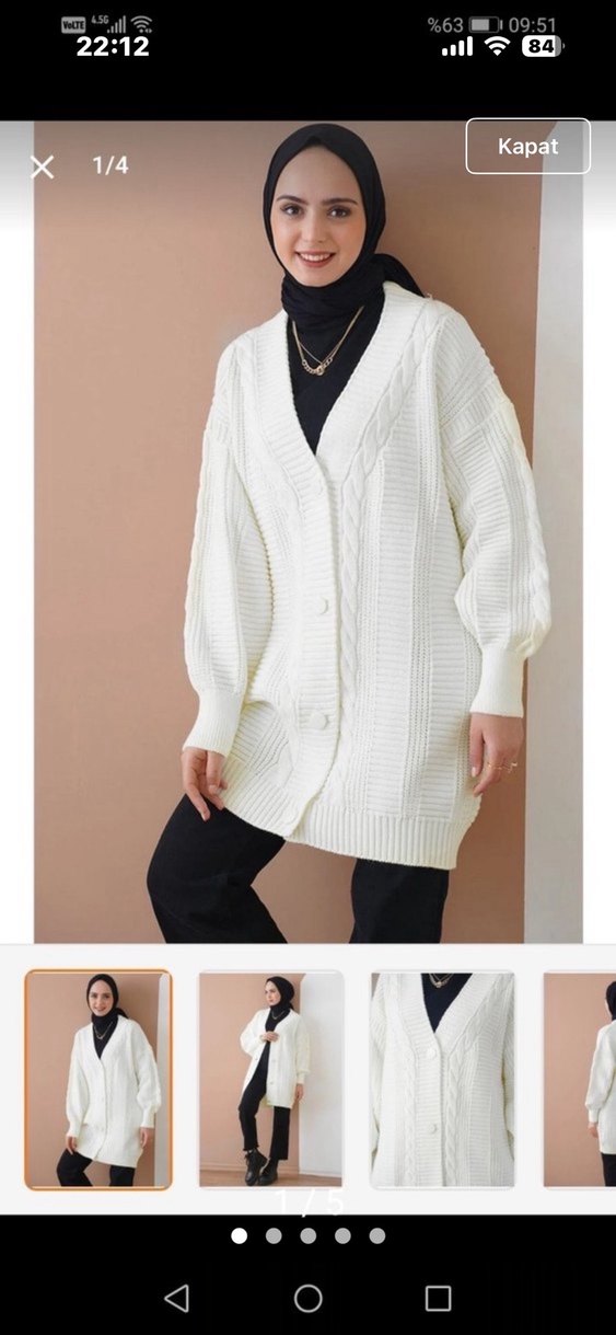 Örgü kumaş, V yaka ve uzun kollu beyaz, bol kesim midi hırka. Günlük kullanıma uygun, rahat ve şık bir sokak stili parçası.