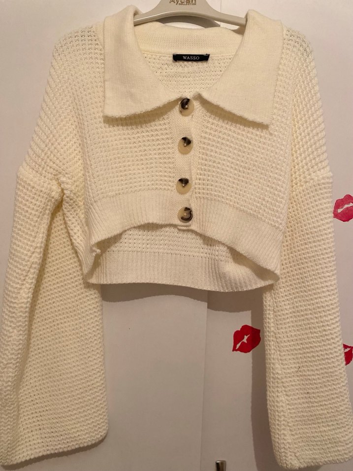 Beyaz, örgü mini bluzdur, yakalı ve uzun kolludur. Rahat kesimi ve düğmeli önüyle günlük sokak stili için uygundur.