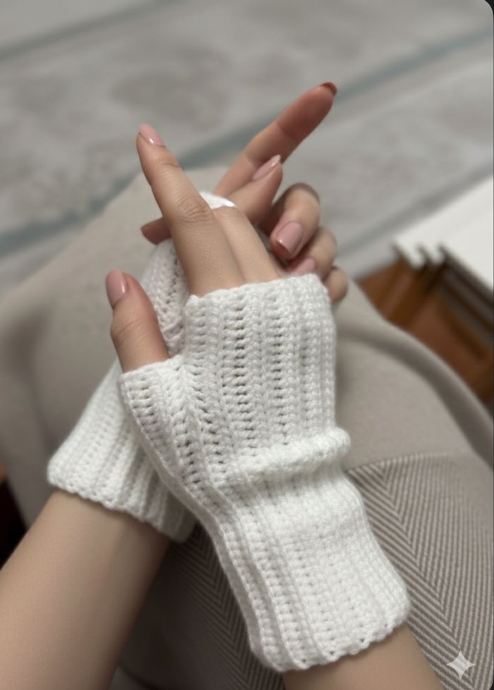 Yumuşak örgü kumaştan yapılmış, beyaz parmaksız kadın eldiveni, rahat ve sade bir sokak stili için uygundur.