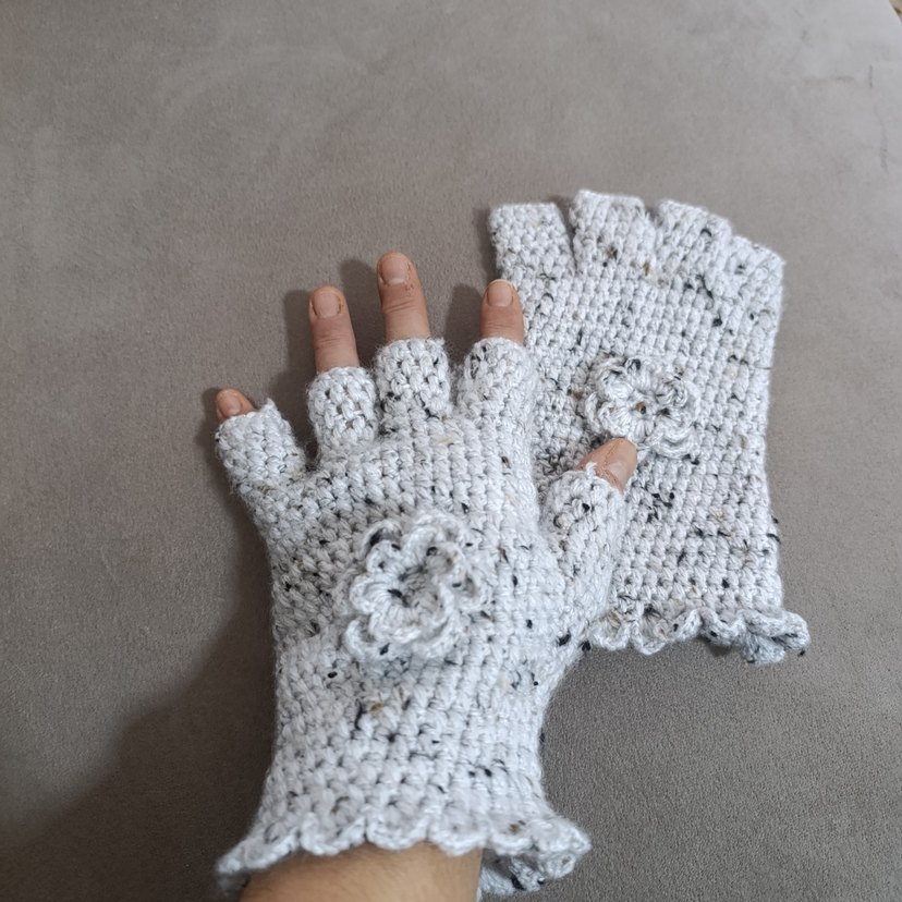 Beyaz renkli, örgü parmakları açık kadın eldivenleri, çiçek detayı ve bohem tarzıyla rahat bir görünüm sunar. Retro ve hippie stillerine uygundur.