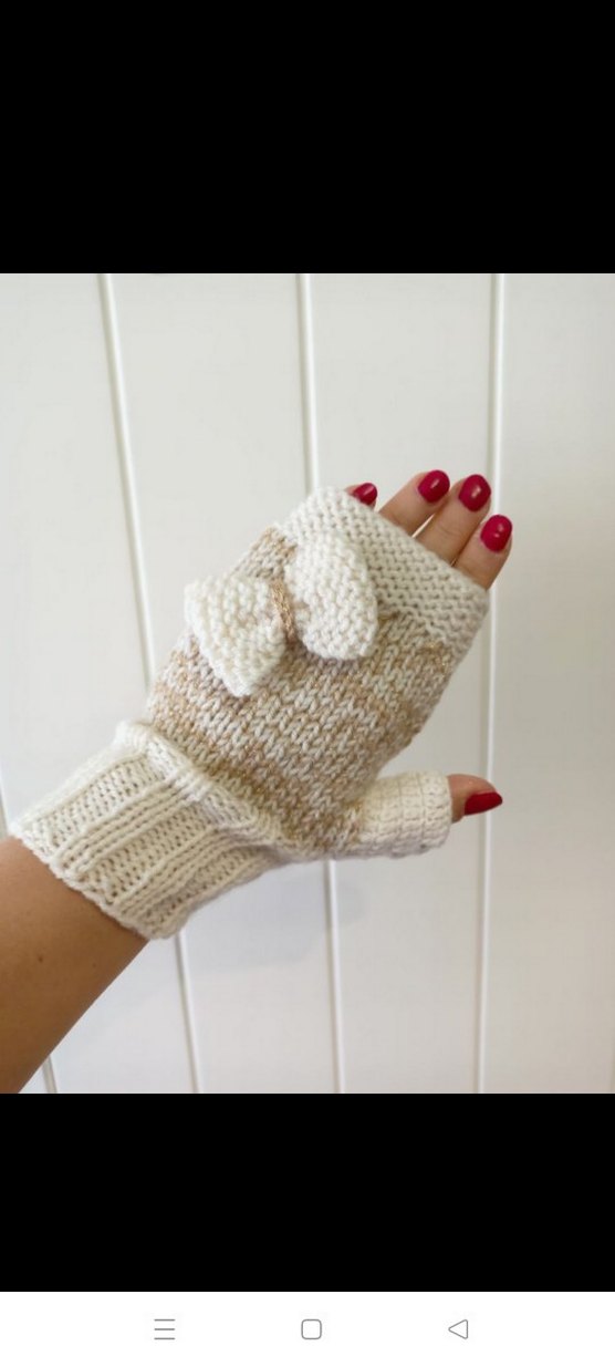 Yumuşak dokulu, beyaz örgü parmaksız eldivenler, dekoratif fiyonk detayıyla rahat ve bohem bir tarz sunar. Serin günler için uygundur.