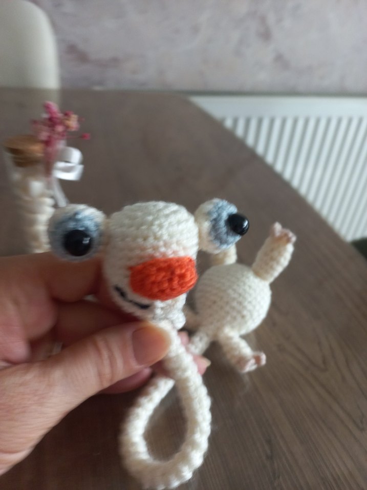 Bu beyaz peluş oyuncak yumuşak iplikle el yapımıdır, büyük gözleri ve turuncu burnu vardır. Tutması kolay halka şeklindedir.