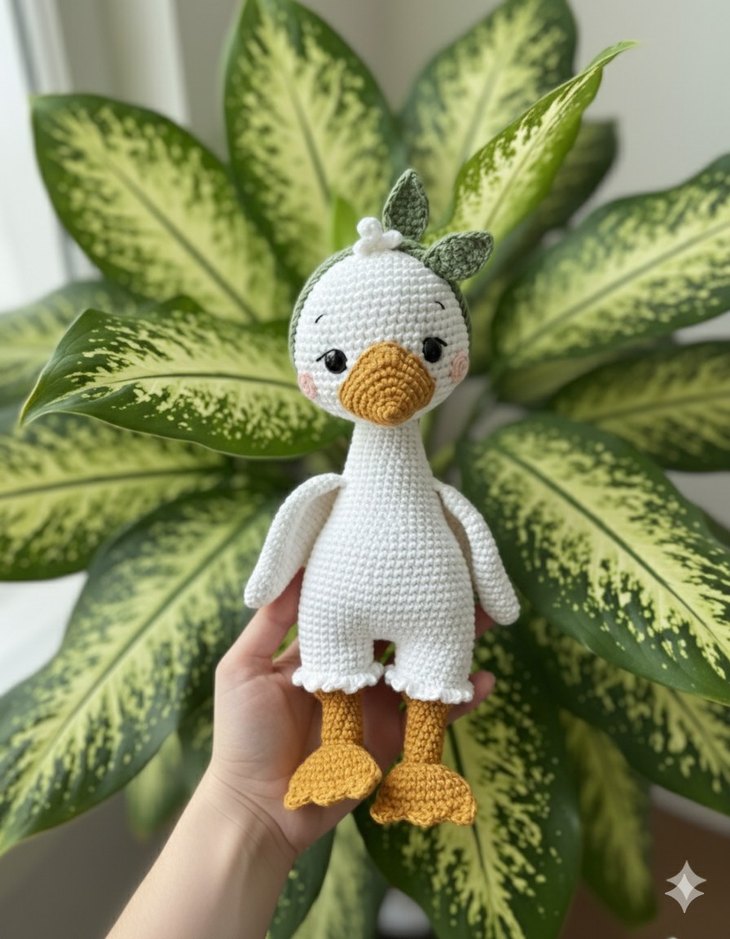 Yumuşak beyaz örgü peluş ördek, sarı ayaklar ve başında dekoratif yapraklarla el yapımı oyuncak.