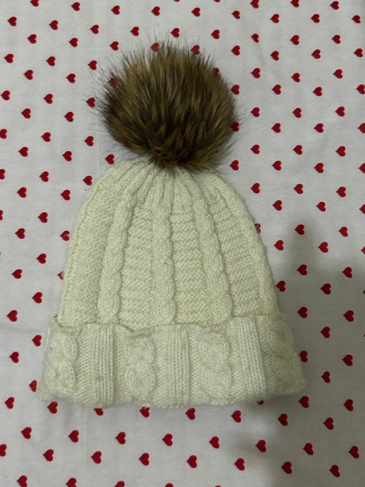 Üstünde suni kürk ponpon olan beyaz örgü kadın bere, rahat ve bohem tarzda. ❄️