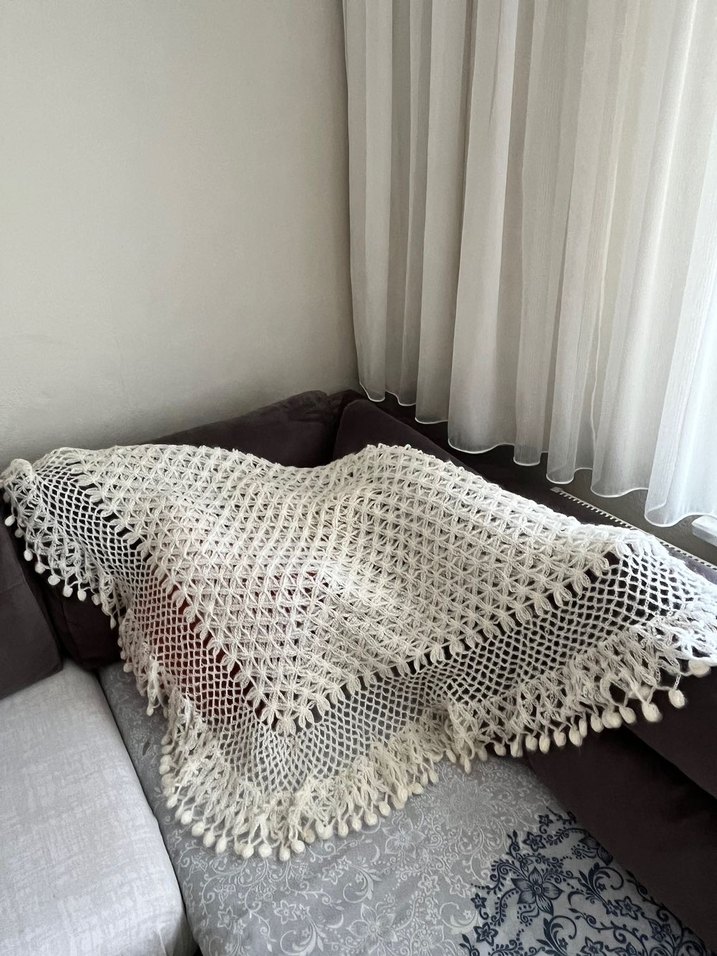 Bu beyaz örgü şal, püsküllü kenarları ve detaylı dokuma deseniyle yumuşak ve rahat bir doku sunar. Çeyiz için yapıldı. Fakat hiç kullanılmadı.Fotoğraf çekmek için poşetinden çıkardım.