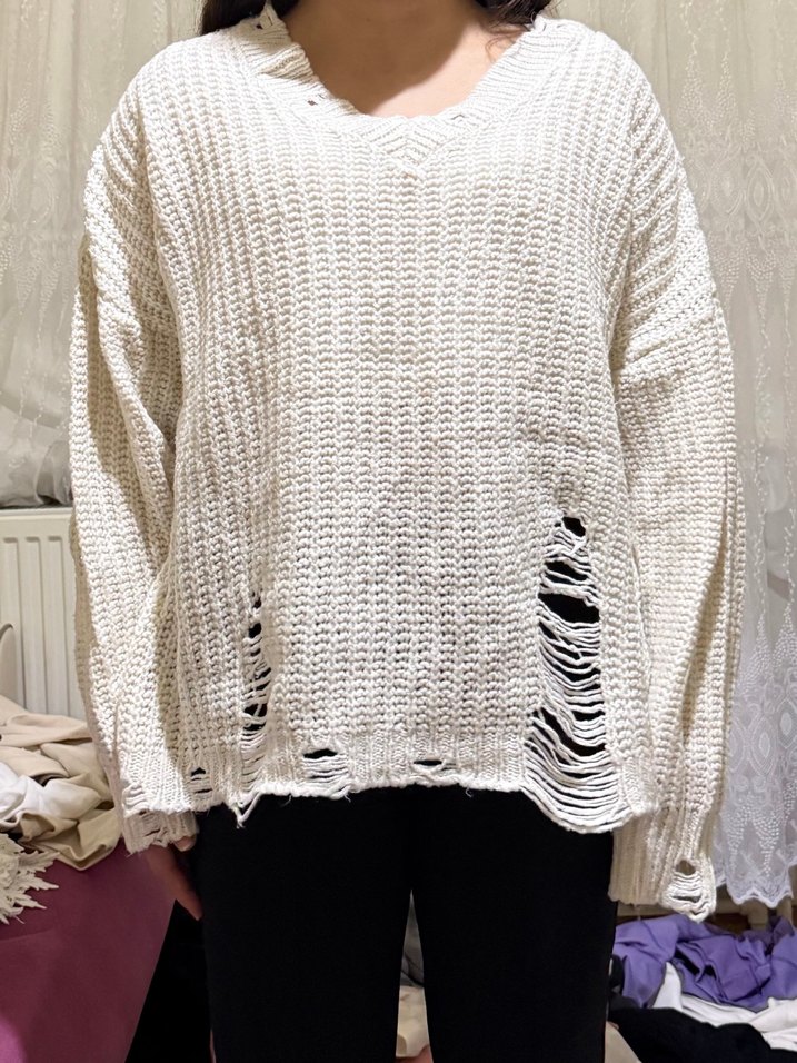 Bu beyaz örgü kazak, uzun kollu ve salaş kesimlidir. Rahat, sokak modası tarzında yıpranmış detaylara sahiptir. Günlük kullanım için uygundur. S/m arasında
