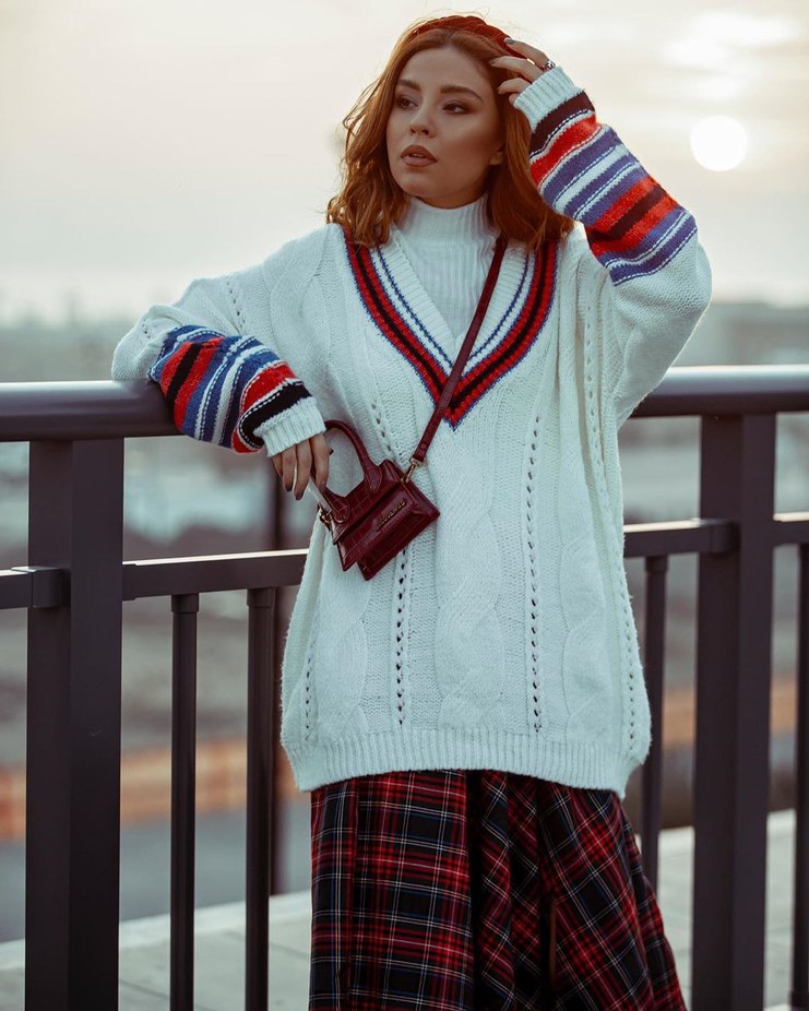 Beyaz örgü, boğazlı, uzun kollu, salaş kesim kazak. Kollarında renkli çizgiler ve ekose desenle rahat ve şık bir görünüm sunar.
