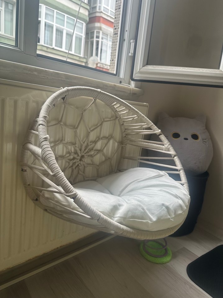 Yumuşak yastıklı beyaz örgü kedi yatağı. Kalorifere takmak için uygundur.