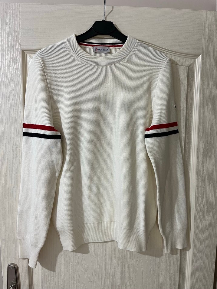 Uzun kollu, yuvarlak yaka beyaz örgü pamuk kazak. Kollarında kırmızı ve lacivert çizgiler bulunur. Regular fit ve normal boyda, günlük ve athleisure tarz için uygun.