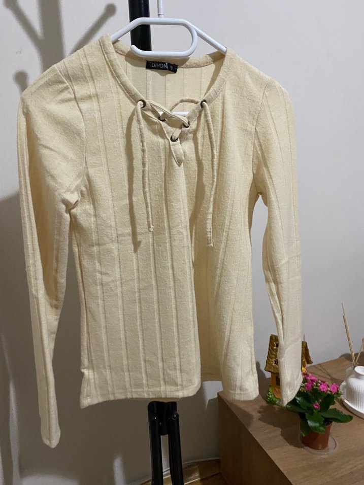 Beyaz renkli, uzun kollu ve örgü dokulu bu kazak, bağcıklı yuvarlak yaka detayıyla rahat ve şık bir görünüm sunar.