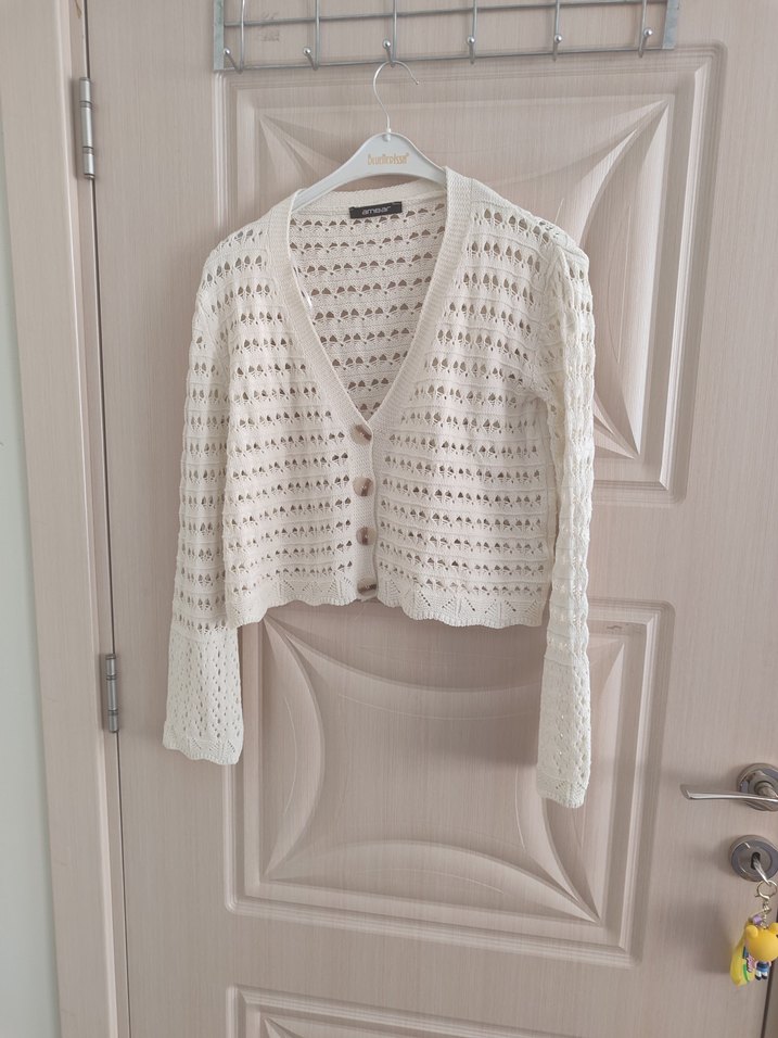 Beyaz renkli, V yaka ve uzun kollu örgü hırka. Rahat, normal boy ve salaş kesimiyle günlük kullanıma uygundur.