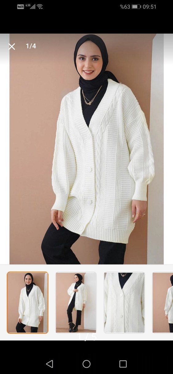 Beyaz örgü, V yaka, uzun kollu, bol kesim midi uzunluğunda hırka. Düz deseniyle sokak stiline ve günlük kullanıma uygundur.