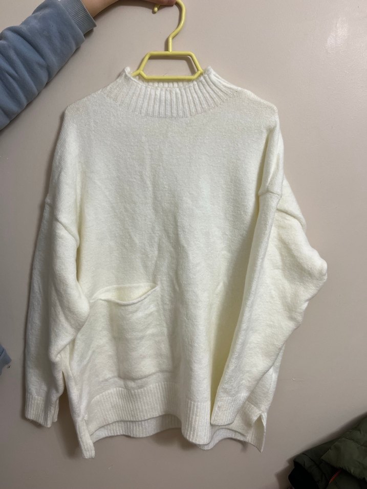 Beyaz örgü, yüksek yakalı ve uzun kollu kadın kazak. Yumuşak fleece kumaştan ve desen içermeyen rahat tasarım.Yeni ve kullanılmamıştır.