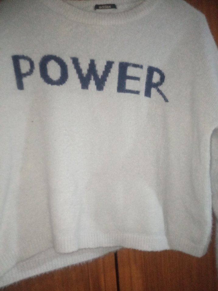 Beyaz örgü yün kazak, yuvarlak yaka ve uzun kollu, rahat kesime sahip. Üzerinde gri "POWER" baskısı bulunur, rahat sokak stili için uygundur.