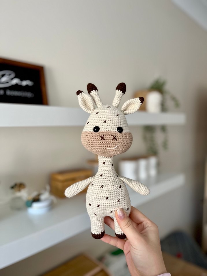 Yumuşak beyaz örgü zürafa peluş oyuncak, kahverengi detaylarla sevimli ve sarılabilir tasarım