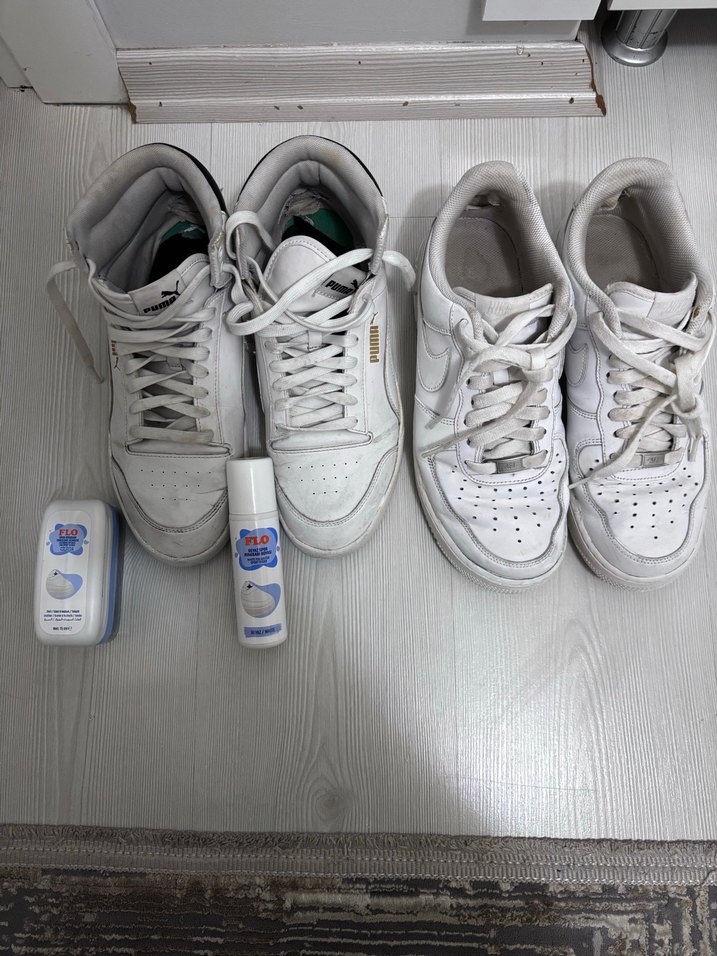 iki adet orijinal ayakkabı pumanın göründüğü gibi hiçbir sorunu yoktur çok ufak deformeleri vardır nike ın ise görüldüğü gibi pek ufak olmayan deformeleri vardır o yüzden neredeyse bedavaya veriyorum yanında da bir adet ileride lazım olabilecek sıfır beyaz ayakkabı boyası ve ayakkabı süngerini yanında hediye ediyorum nike 43 puma 42 numaradır