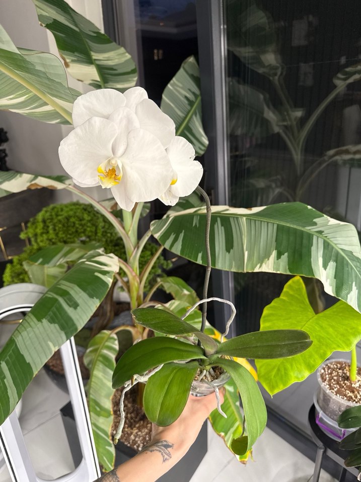 Canlı yeşil yapraklara sahip beyaz orkide, ev dekoruna doğal bir tazelik katıyor. Zarif yaprakları ve parlak merkeziyle şık bir görünüm sunar.