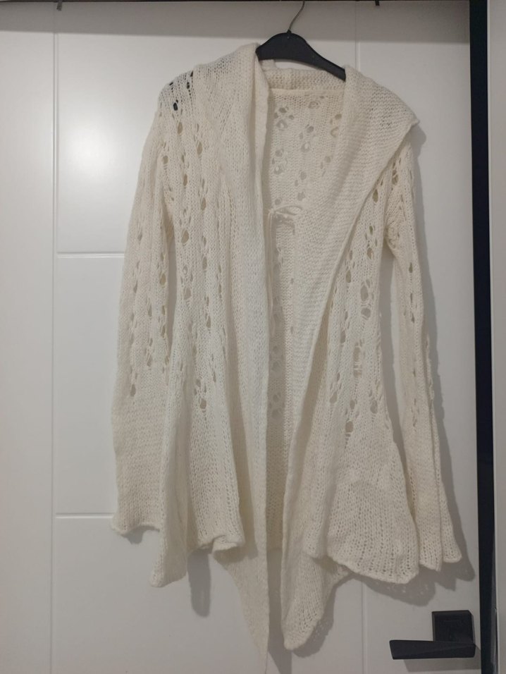 Beyaz örme, bol kesim V yakalı kadın hırka. Uzun kollu, orta boy ve rahat bohem tarzda, günlük kullanıma uygun.