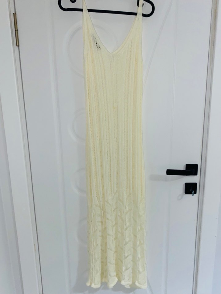 Beyaz, örme kumaştan yapılmış, bohem tarzı uzun, kolsuz elbise. V yakalı ve vücuda oturan kesimiyle gündelik kullanıma uygundur.