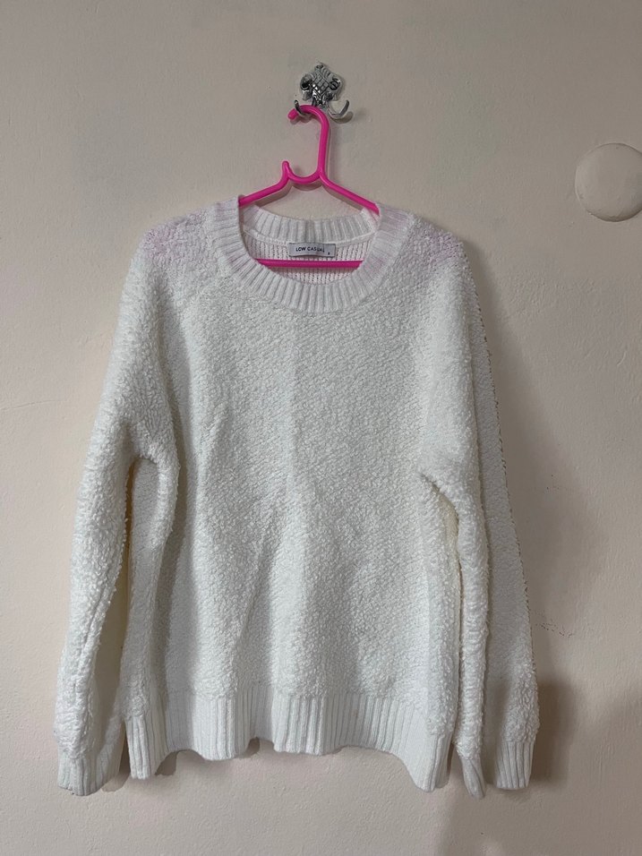 Beyaz örme kazak, uzun kollu ve yuvarlak yakalıdır. Normal boyda, bol kesimdir ve yumuşak örme kumaştan rahat bir kullanım sunar.