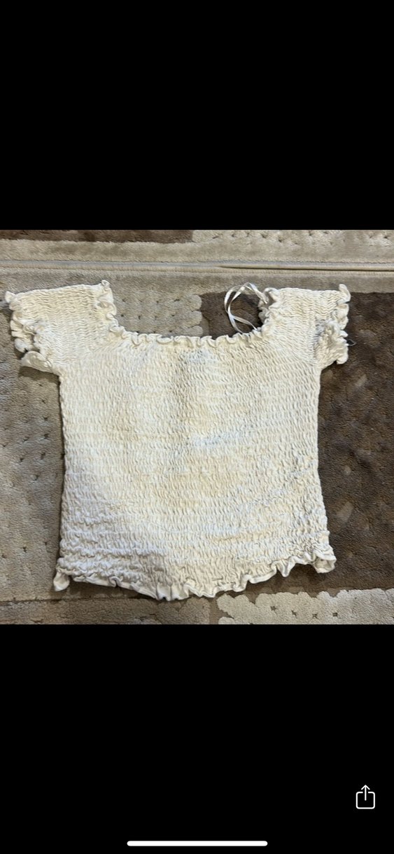 Nefes alabilir keten kumaştan yapılmış, örme dokulu, beyaz renkli, kısa kollu ve kısa boylu, bohem tarzda rahat bir bluz.