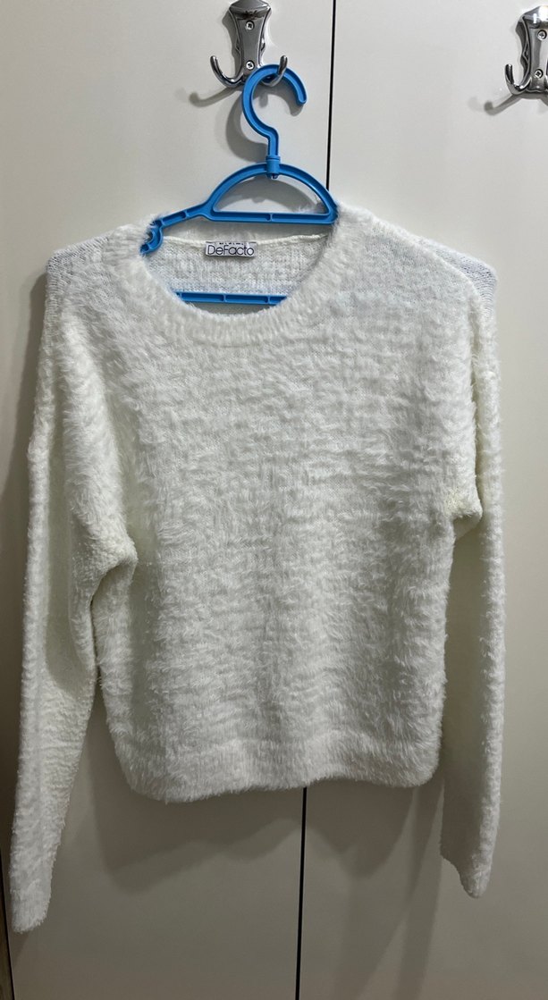 Beyaz örme, uzun kollu ve yuvarlak yaka kazak. Yumuşak sentetik kumaştan, rahat ve bol kesim, günlük sokak stiline uygun.