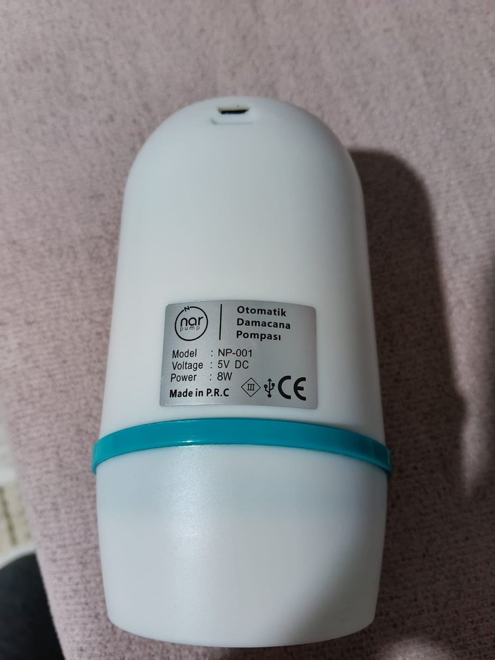 Beyaz renkli otomatik damacana pompası, 5V DC voltaj ve 8W güç ile çalışır. Model NP-001, P.R.C. üretimidir. sadece borusu yok