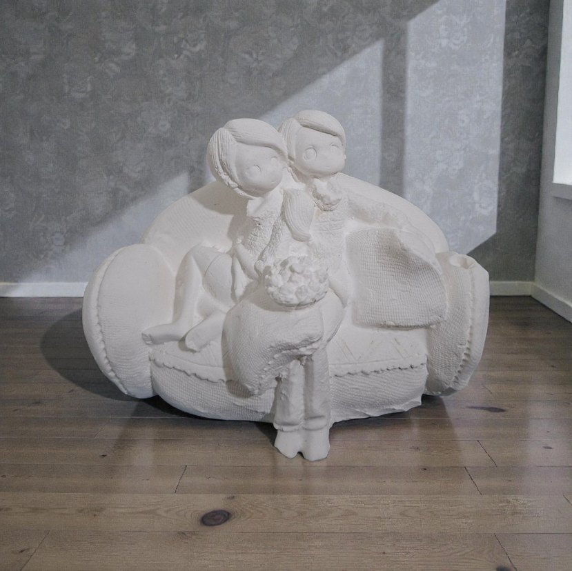 Beyaz renkte, detaylı dokulara sahip bir kanepede oturan çift figürini. Hafif renk tonunda ve zarif tasarımlı.