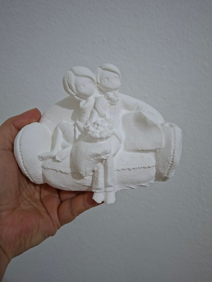 Beyaz renkte, detaylı işçilikle yapılmış, bir çiftin kanepede oturduğu figürin.