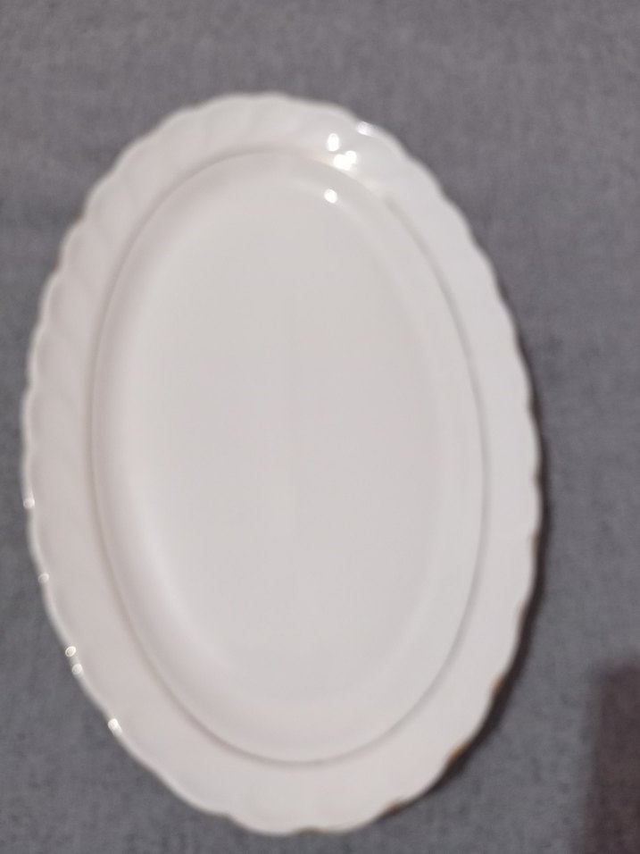 Gri detaylı, kırçıllı beyaz porselen oval servis tabağı, dalgalı kenarlarıyla yemek sunumu için uygundur. ️