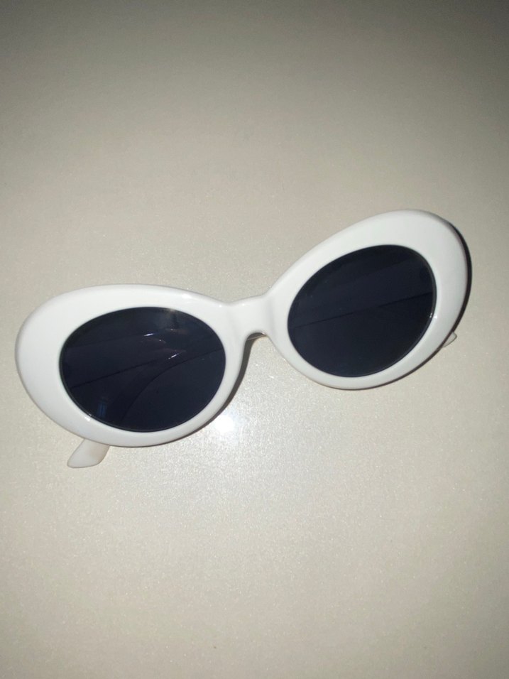 Retro tarzda beyaz oval çerçeveli, şeffaf gri camlı kadın güneş gözlüğü. Pazarlık payı vardır.
