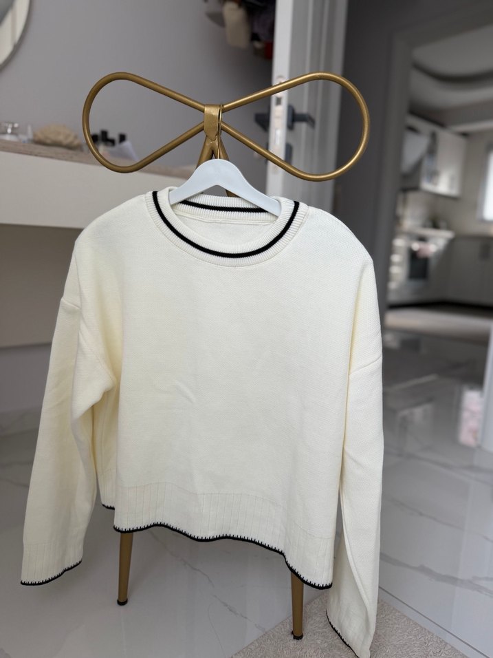 Beyaz triko kazak, bisiklet yaka ve uzun kolludur. Oversize kesimi ve siyah kenar detaylarıyla minimalist ve rahat bir tarz sunar.