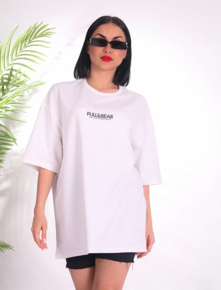 Pamuklu, kısa kollu, beyaz tişört, rahat bir kesime sahip. Önünde 'PULL&BEAR' baskısı bulunur, günlük şıklık için uygundur.