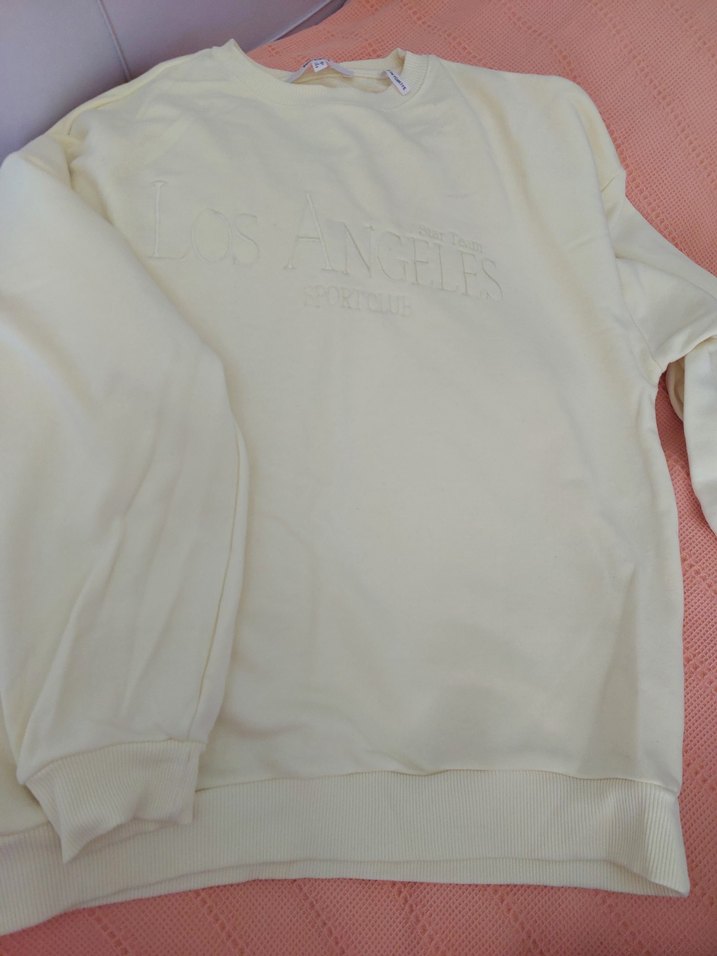 Yumuşak ve sıcak kumaştan, sari oversize, bisiklet yaka ve uzun kollu sweatshirt. Hafif kabartmalı yazı detayıyla günlük kullanıma uygun.