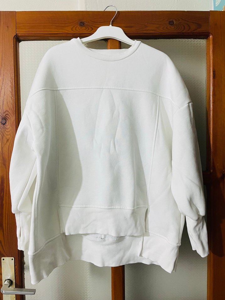 Beyaz, yuvarlak yaka, uzun kollu ve bol kesim kadın sweatshirt. Yumuşak ve sıcak kumaştan, desensiz ve günlük kullanıma uygun.