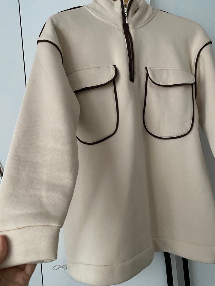 Beyaz, rahat kesim, uzun kollu ve bisiklet yaka kadın sweatshirtü. Önünde koyu renk detaylı iki cep ve yarım fermuar bulunur. Yumuşak ve sıcak kumaştan üretilmiştir. ❄️