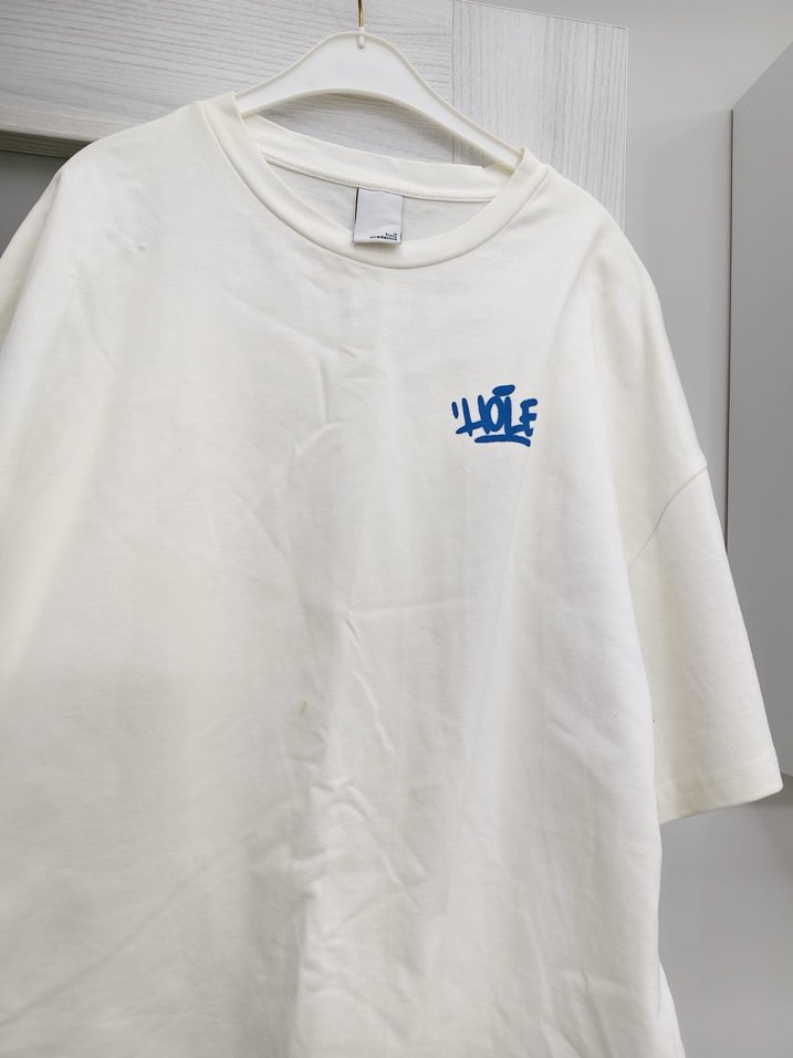 Bu beyaz pamuklu tişört, bol kesim, kısa kollu ve yuvarlak yaka özelliklerine sahiptir. Göğüste küçük mavi baskı detayı ile günlük kullanıma uygun, rahat ve şık bir modeldir. Üzerinde bir sarı leke var minik çıkartmadım