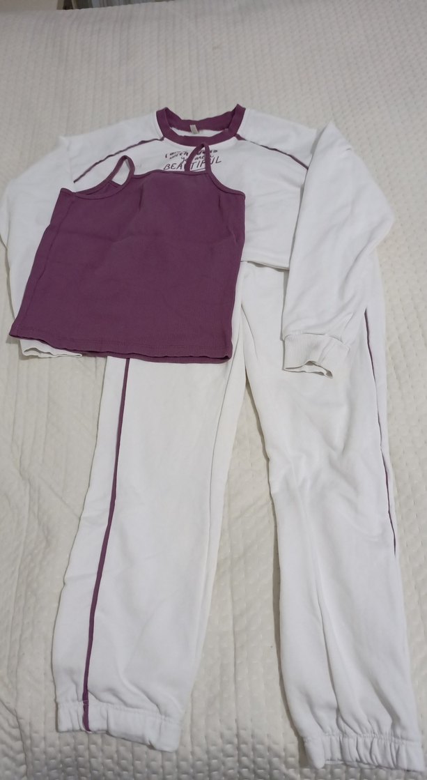 Beyaz oversize sweatshirt ve eşofman takımı, uzun kollu ve yuvarlak yakalı. Mor askılı üst ile kombinlenmiş. Rahat ve yumuşak kumaş, sokak stili için uygun. ✨