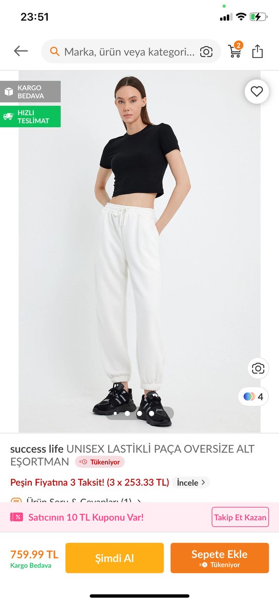 Beyaz, lastikli paçalı, oversize kesim rahat ve şık kadın eşofman altı. İçi şardonlu polarlı aşırı sıcak tutuyor. Boyunuz 175'in altındaysa paçası tam olur üstüne kıda gelebilir. Bana kısa geldiği için satıyorum maalesef. L yazıyor ama M beden uyumlu bence.