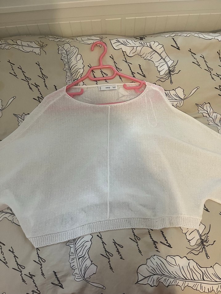 Bu beyaz örgü kazak, oversize kesimi, uzun kolları ve yuvarlak yakasıyla rahat ve şık bir sokak stili sunar. Yazlık baharlık Yenidir birkez giyildi