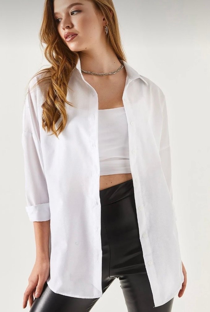 Beyaz parlak pamuklu gömlek, yakalı ve uzun kollu, rahat kesimiyle günlük sokak stili için uygundur. Zahmetsiz şıklık ve konfor sunar.