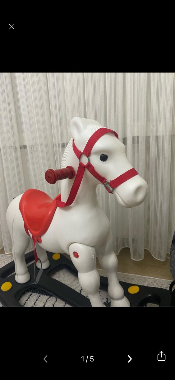 Beyaz oyuncak at, renkli kırmızı eyer ve koşum takımı ile çocukların oyun oynaması için tasarlanmıştır. Sağlam tabanı güvenlik sağlar.