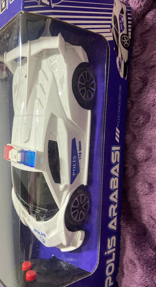 Beyaz renkli, detaylı ve gerçekçi tasarıma sahip oyuncak polis arabası.