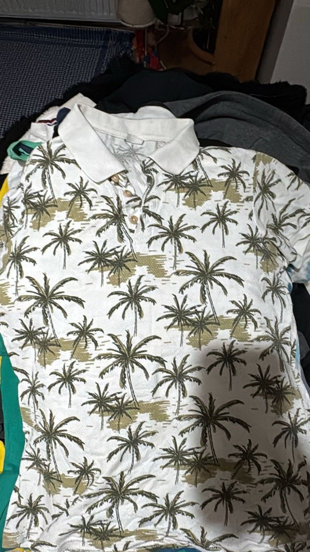 Düğmeli, yakalı ve kısa kollu beyaz polo tişört, koyu palmiye desenleriyle casual tarz sunar.