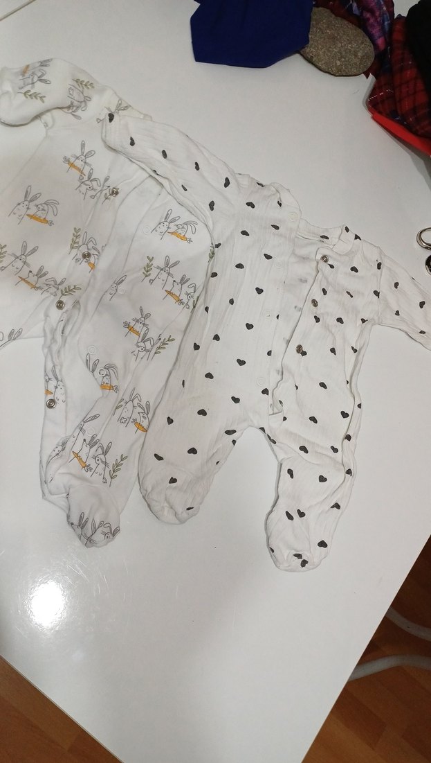 beyaz pamuk bebek tulumu, gri detaylarla konforlu bir kullanım sunar.