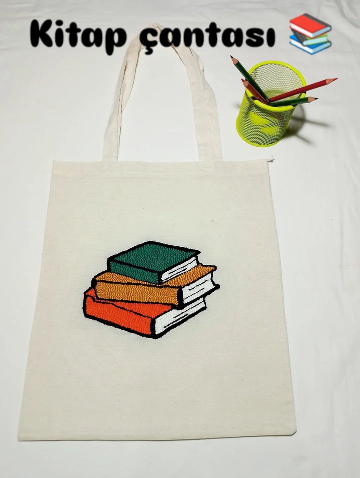 Beyaz pamuk kumaştan yapılmış, kitap desenli, minimalist ve bohem tarzda kadın çantası. Günlük kullanım için rahat ve şık.