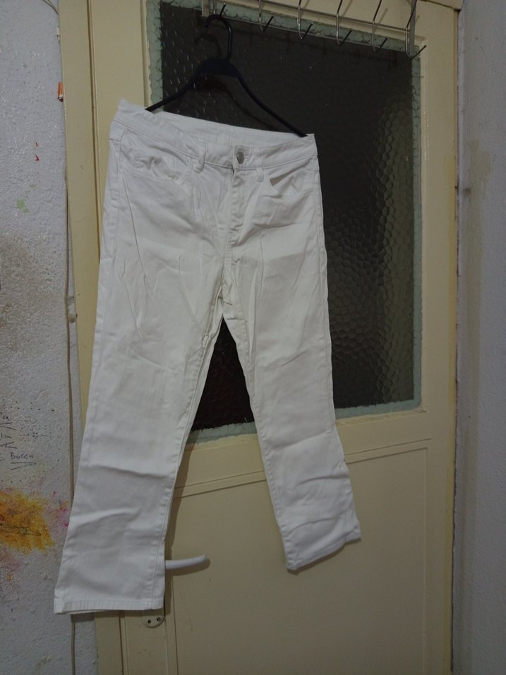 Beyaz pamuk kumaştan, midi boy ve regular fit kesime sahip, gündelik kullanıma uygun rahat kadın pantolonu.