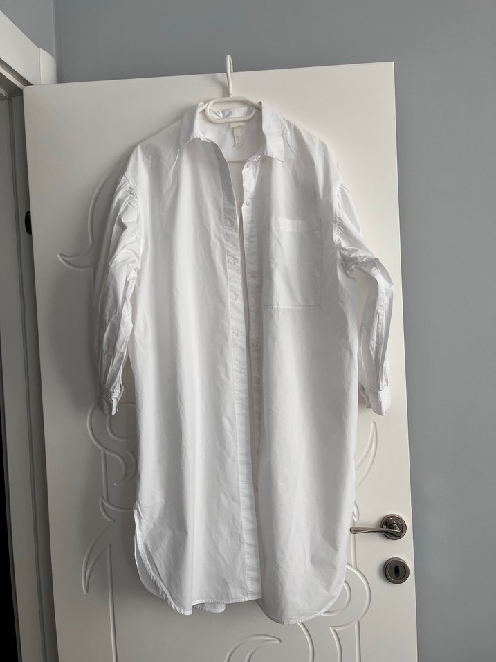 Beyaz pamuk midi gömlek, yakalı, az kullanıldı kusuru tok temiz ürün. Diz kapağına geliyor. Kumaş pamuk. S, m, l bedene olur